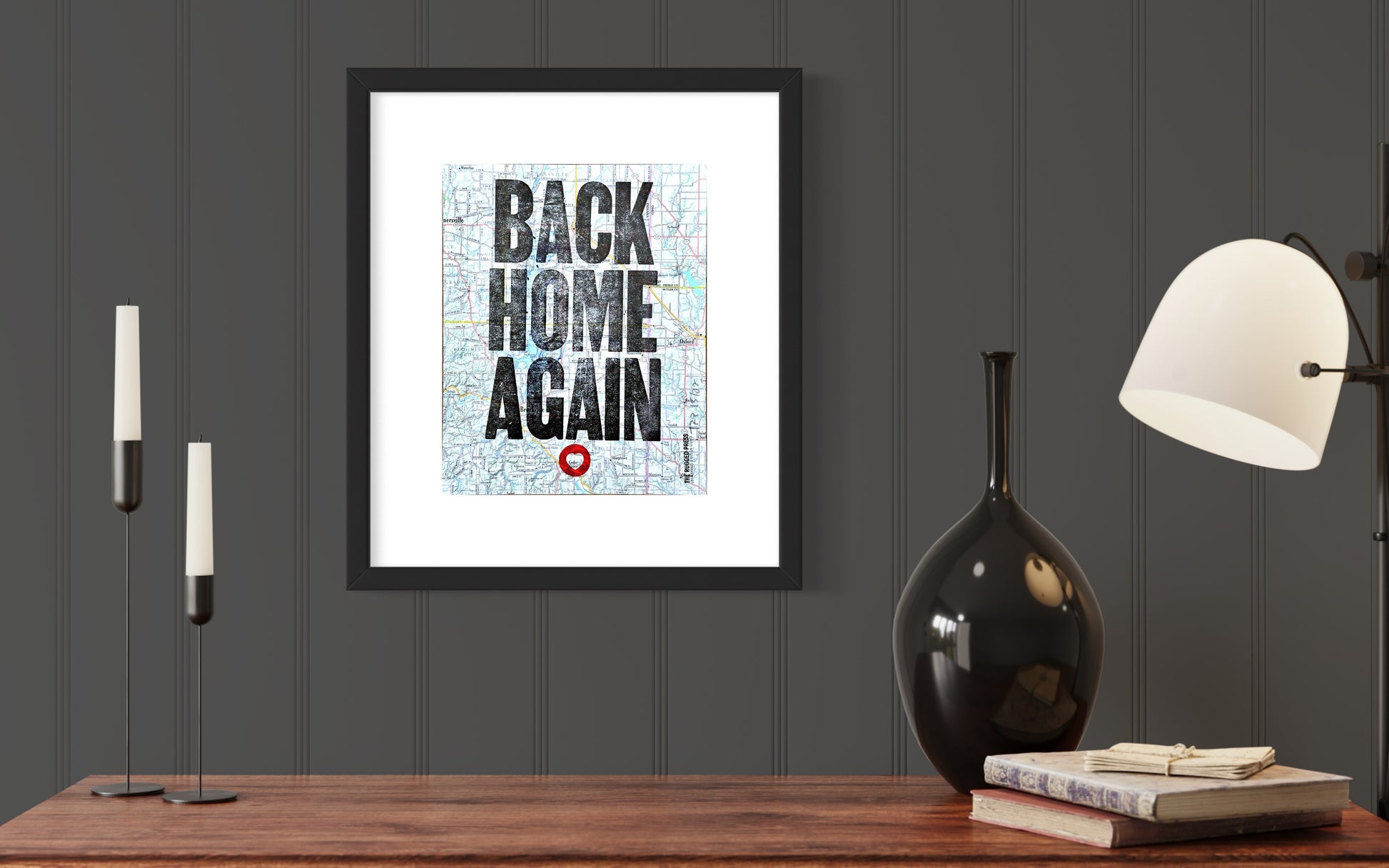 Back Home Again – 8x10 letterpress poster on a 2022 Rand McNally Indiana Road Atlas – no two are the same, two-color, hand-printed on our restored 1909 Chandler & Price floor model printing press using historical wood type. Note – Locations vary and no two prints are the same.