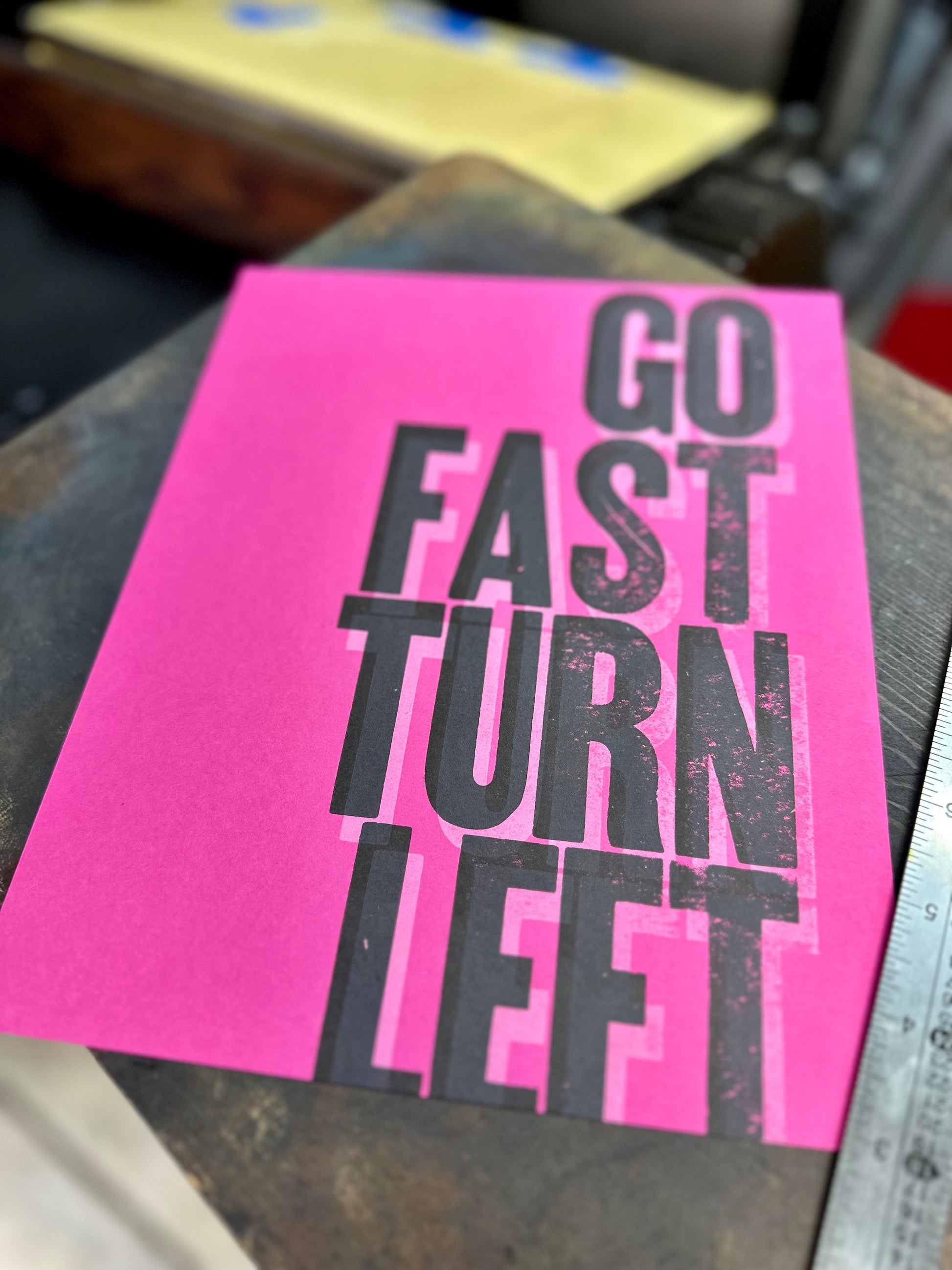 Printed on your choice of razzleberry or sour apple paper by French paper, this print has some heft. The letters are pressed into the paper in a tactile way no other printing method can match. The message was printed using rare historical wood type from our collection.