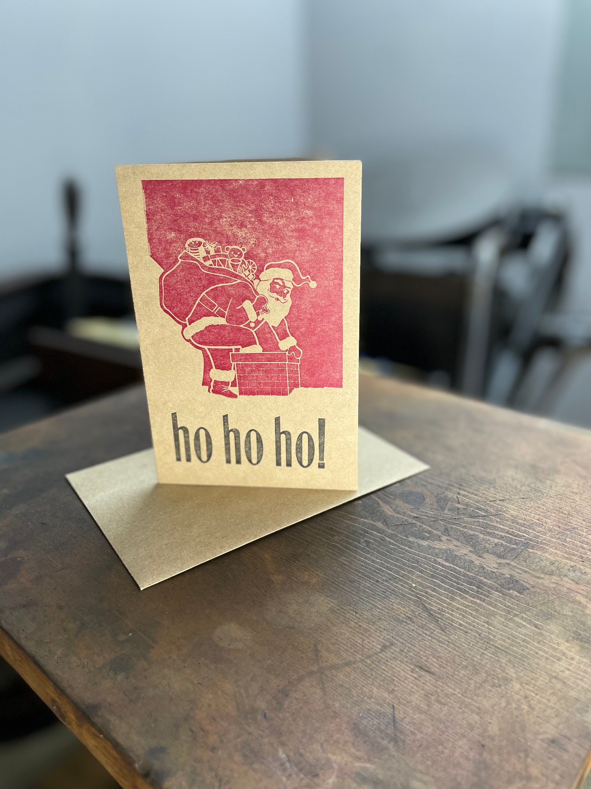ho ho ho – 4x6 letterpress Christmas card on luxurious kraft paper, two color, hand-printed on our restored 1909 Chandler & Price floor model printing press using historic engraved cuts and metal type.