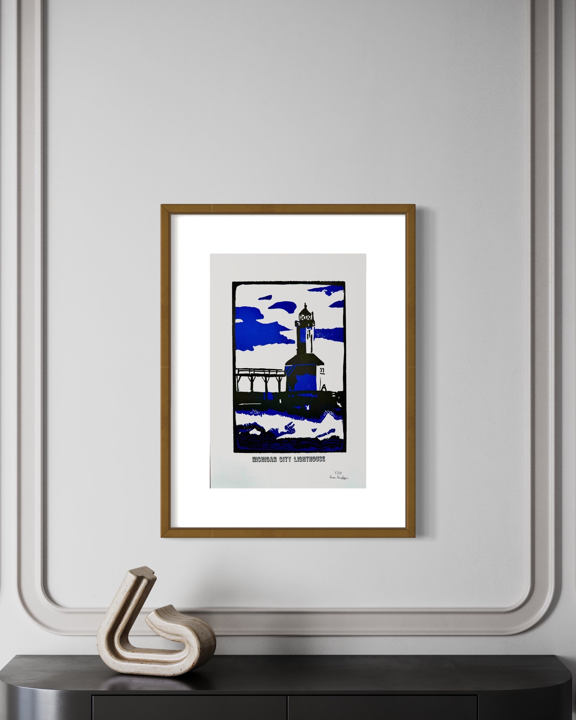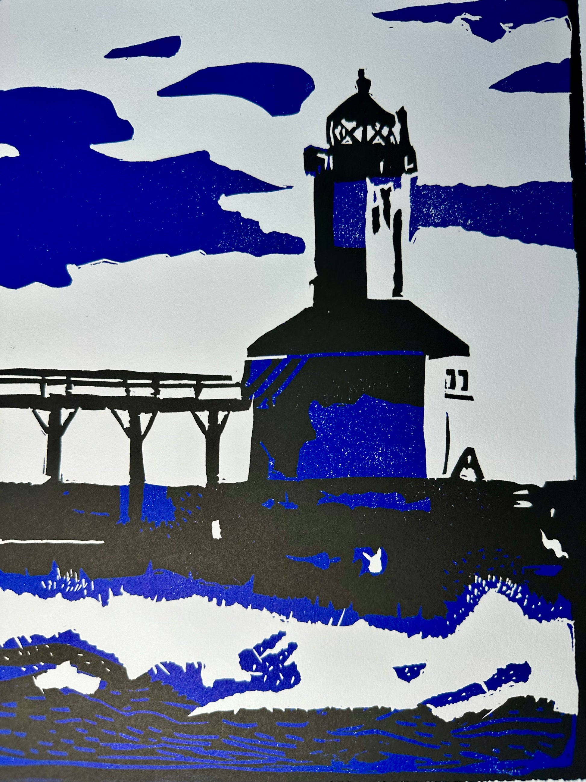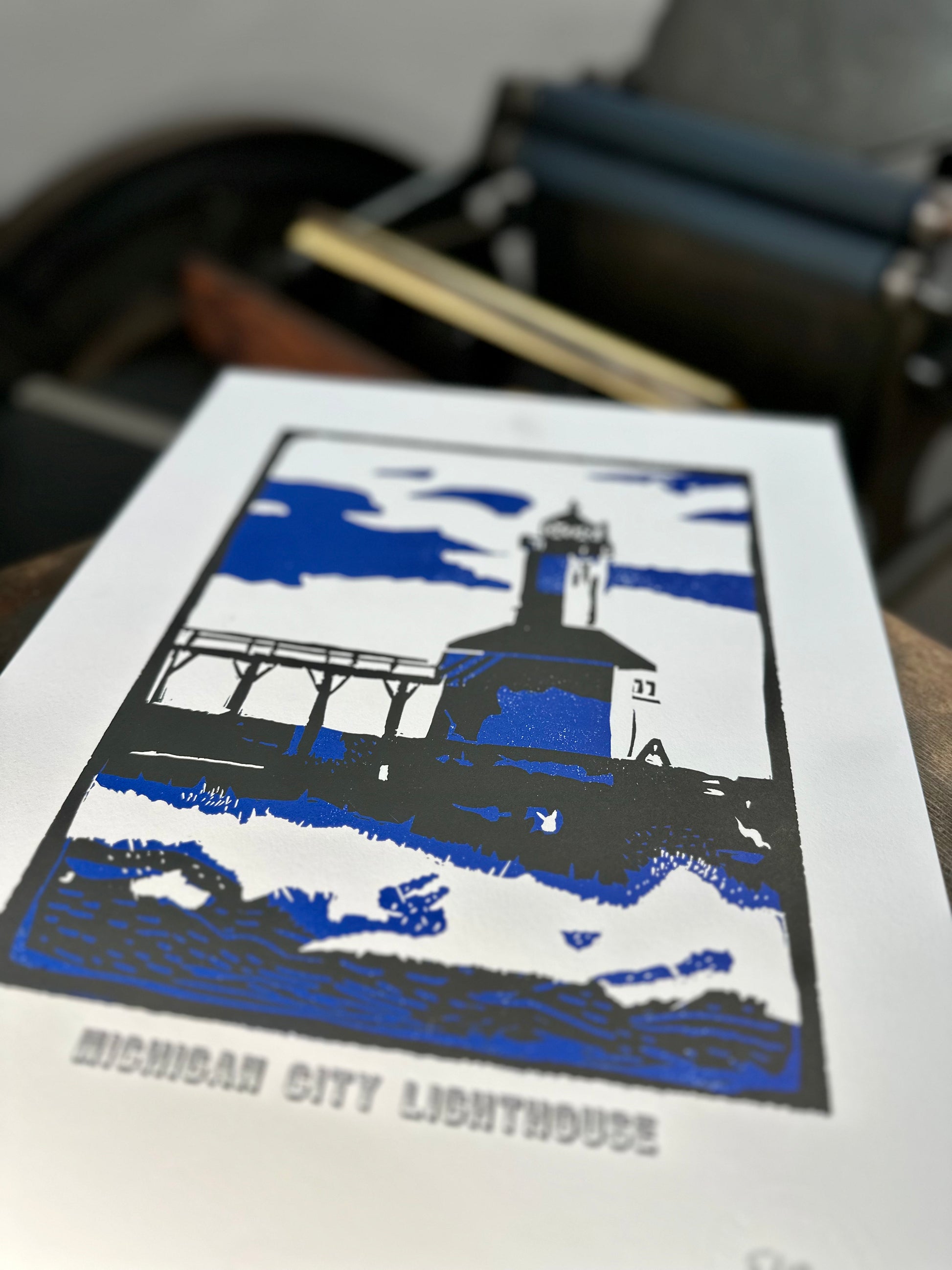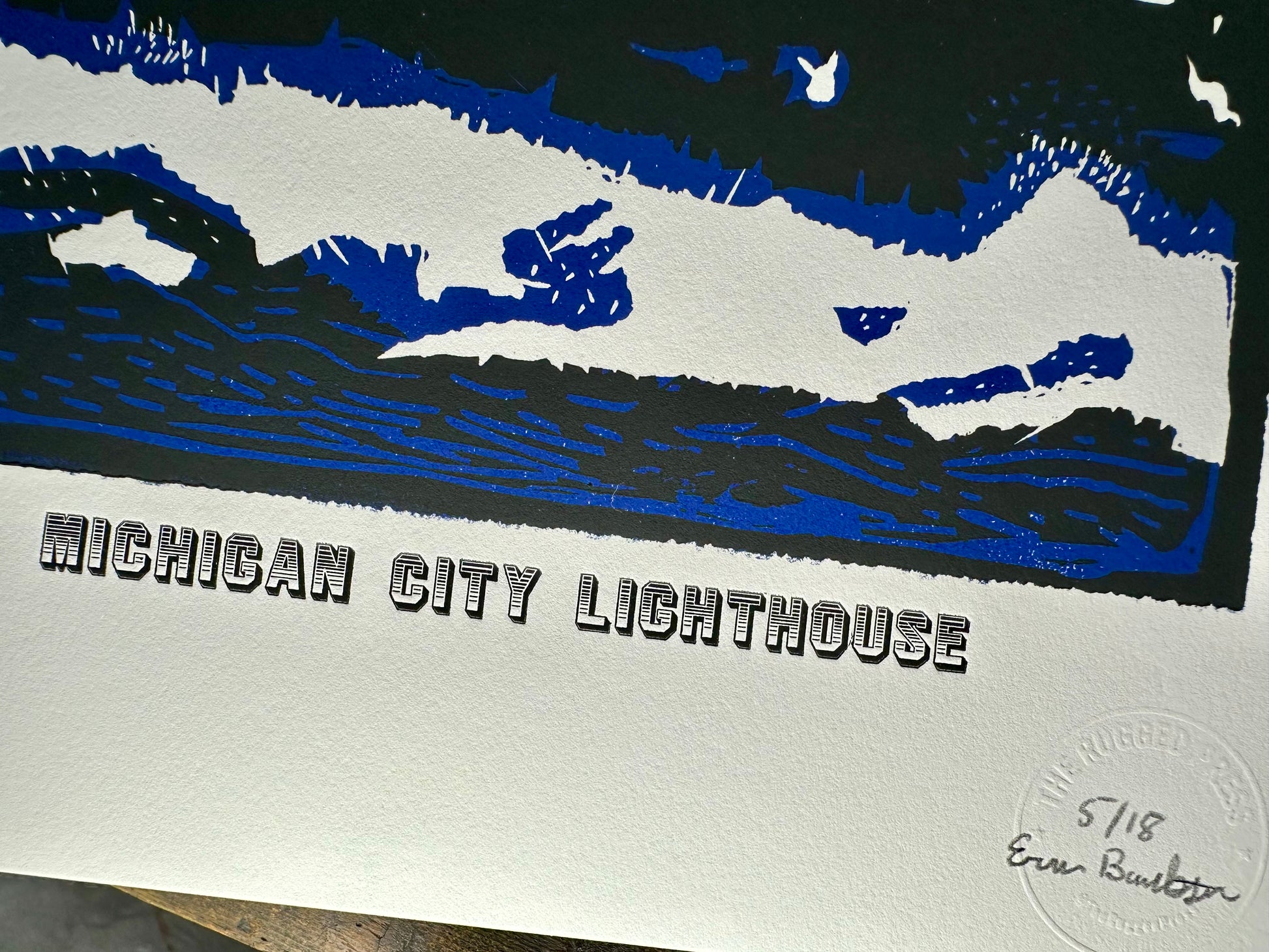 This two-color 11 x 14 reduction print of the iconic Lake Michigan Lighthouse was hand-carved into a linoleum block. The hand-mixed blue ink was printed first. The block was then removed from the press, and the blue areas were carved away. The block was locked back into the press, and the black ink printed. Hand printed on 500 gsm Savory 100% cotton paper. The luxurious paper has some serious heft to it.