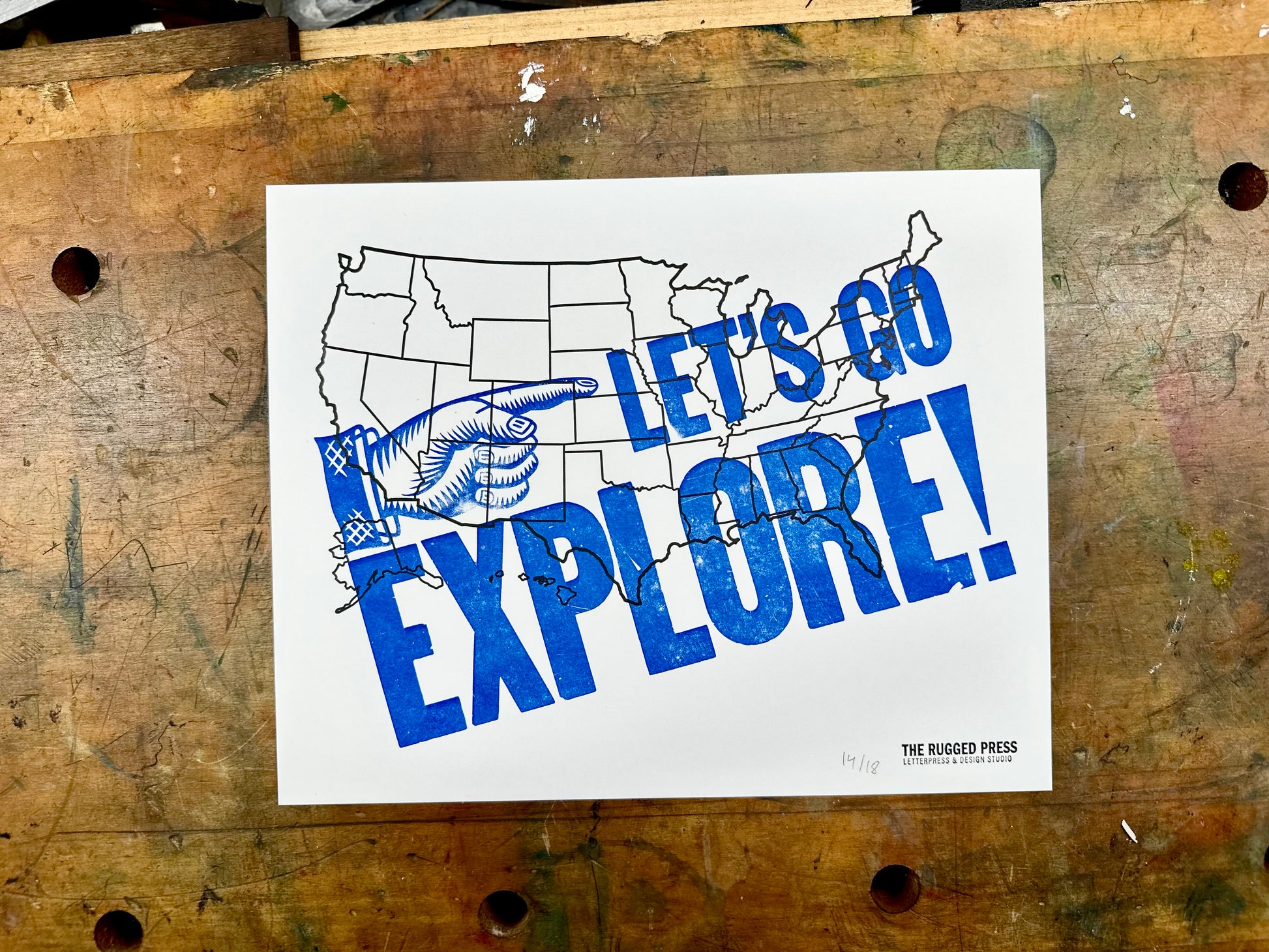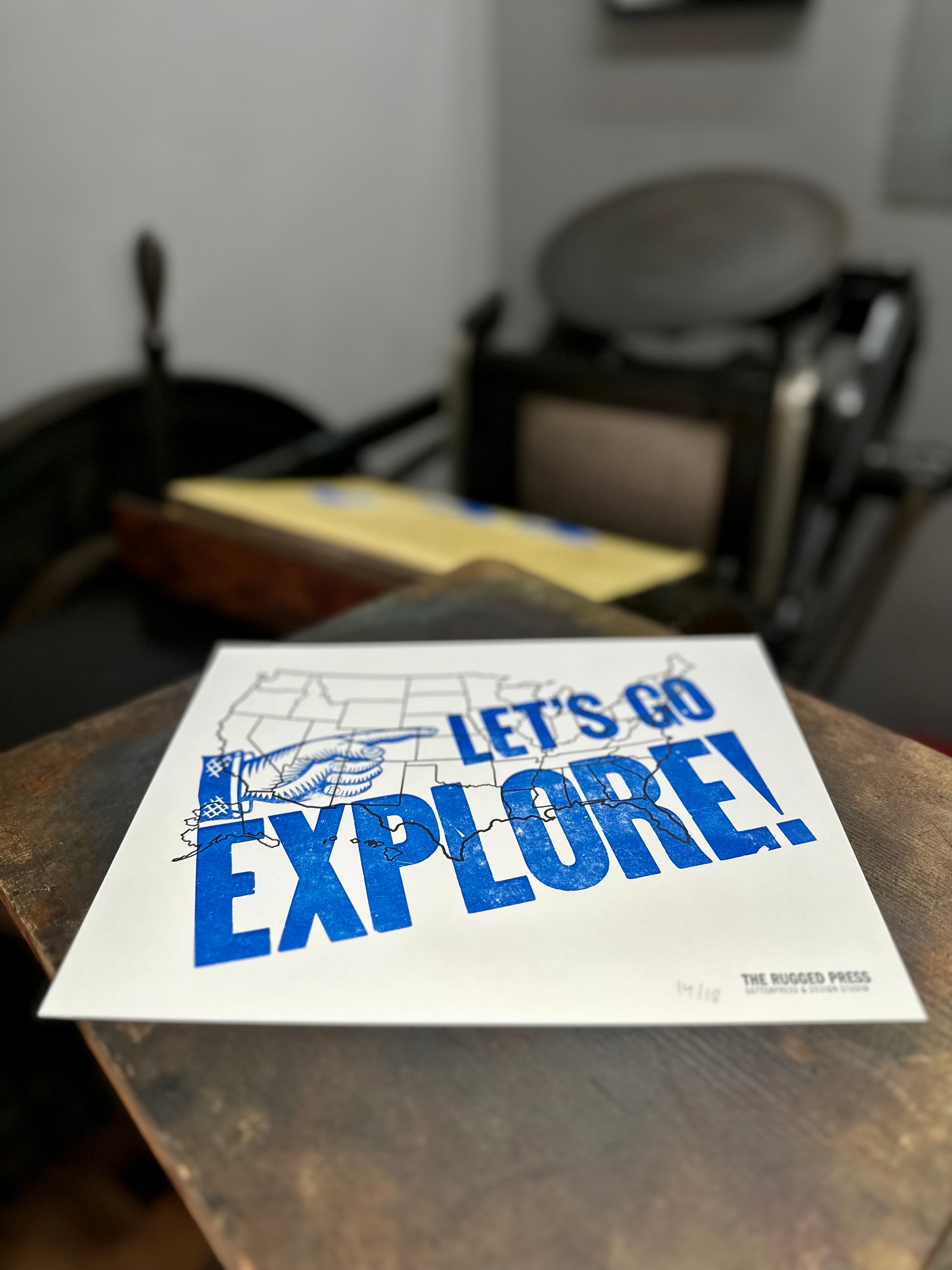 Letterpress printing is a traditional form of printing involving the use of historical letters and designs cut into wood and metal, which are pressed into the surface of the paper to create a tactile embossed effect. This printing method was developed in the 15th century and was widely used for centuries to produce books, posters, business cards, and other printed materials. Today, The Rugged Press and other contemporary printers value letterpress printing for its handmade, visually distinct, and tactile qualities that can not be achieved with digital printing methods.