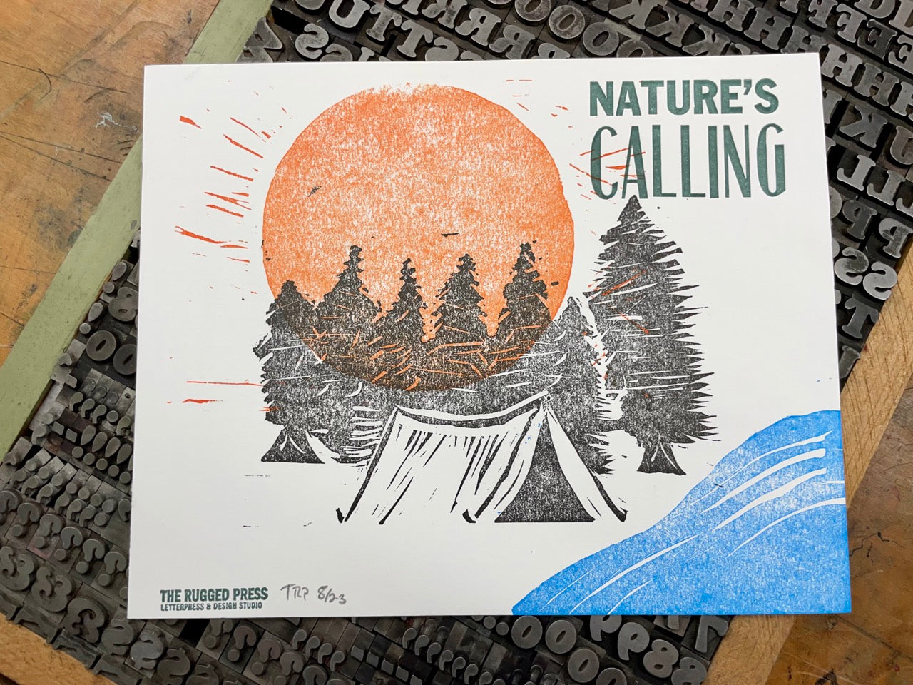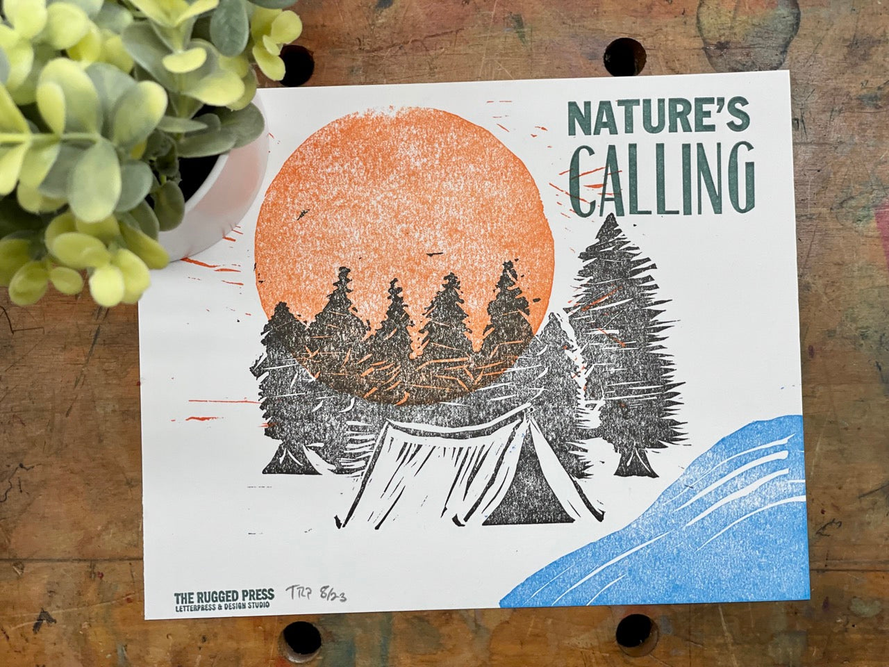 Nature's Calling – 8x10 letterpress poster on Leigon Cotton paper, hand-printed using hand-carved linoleum block and historic metal type on our restored 1909 Chandler & Price floor model printing press.