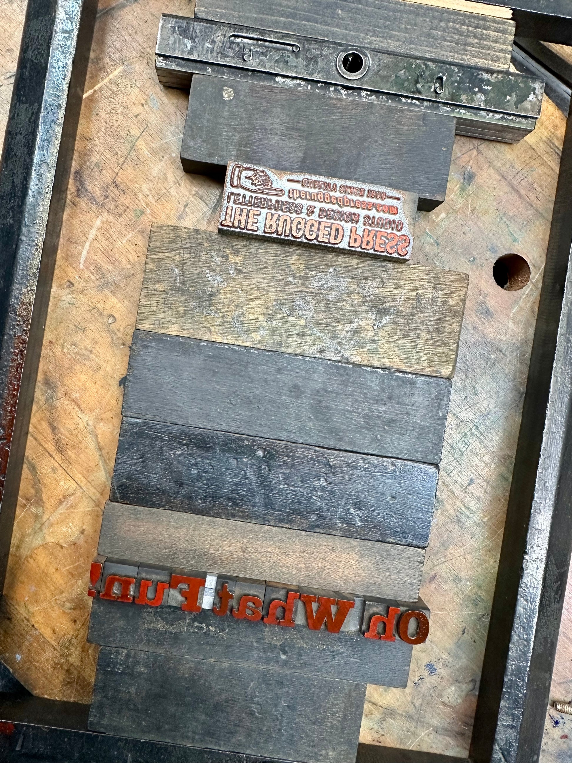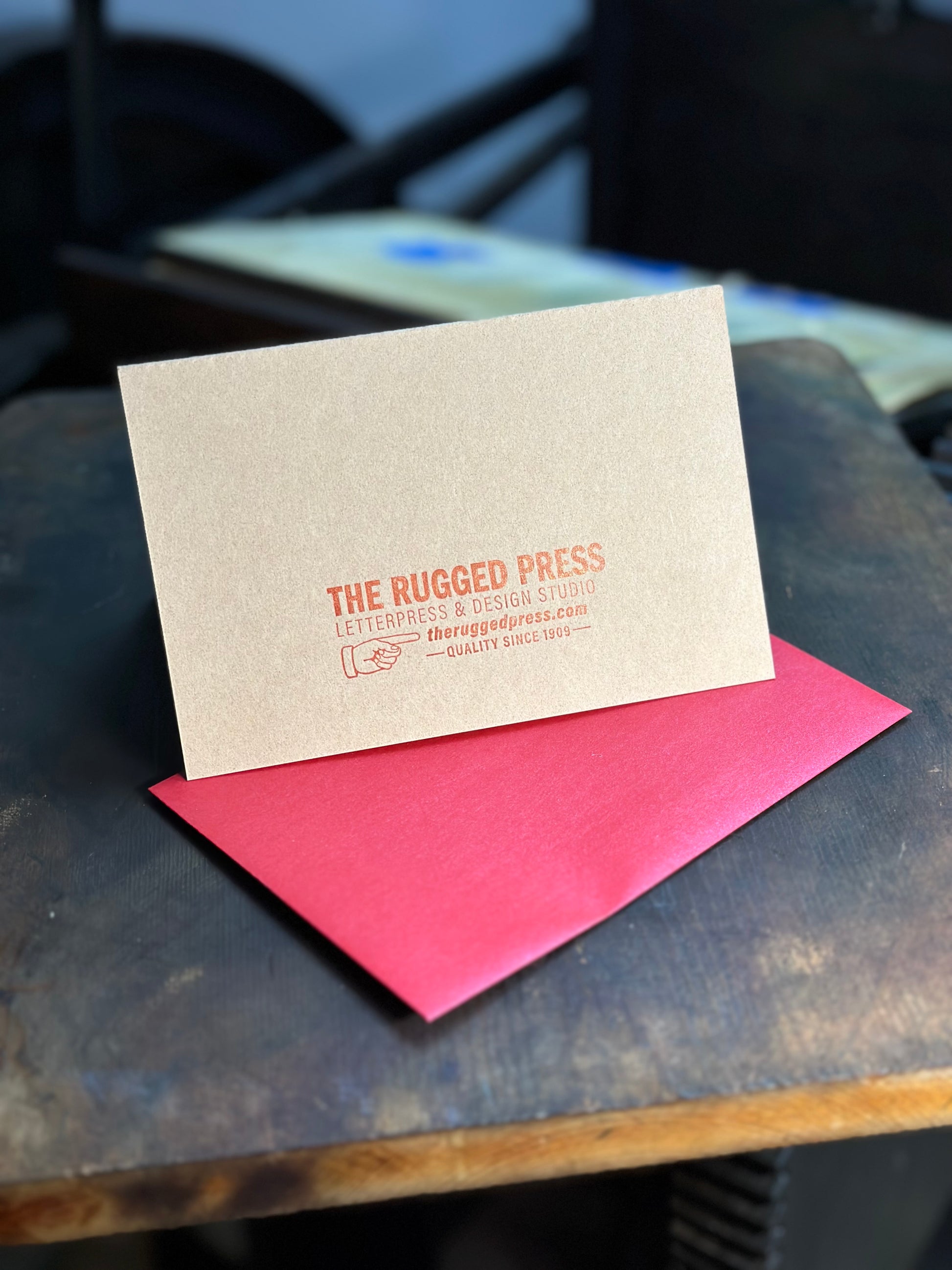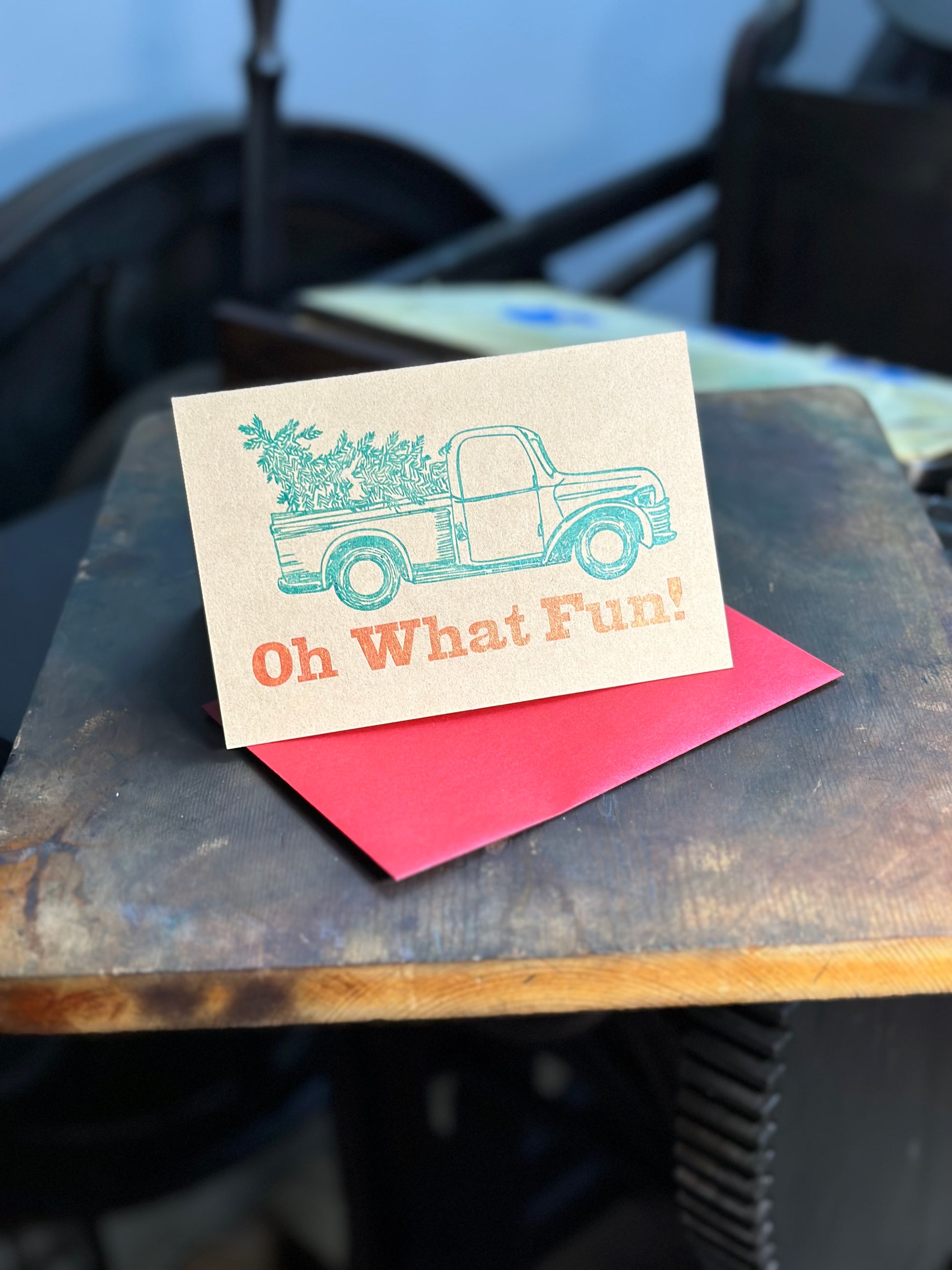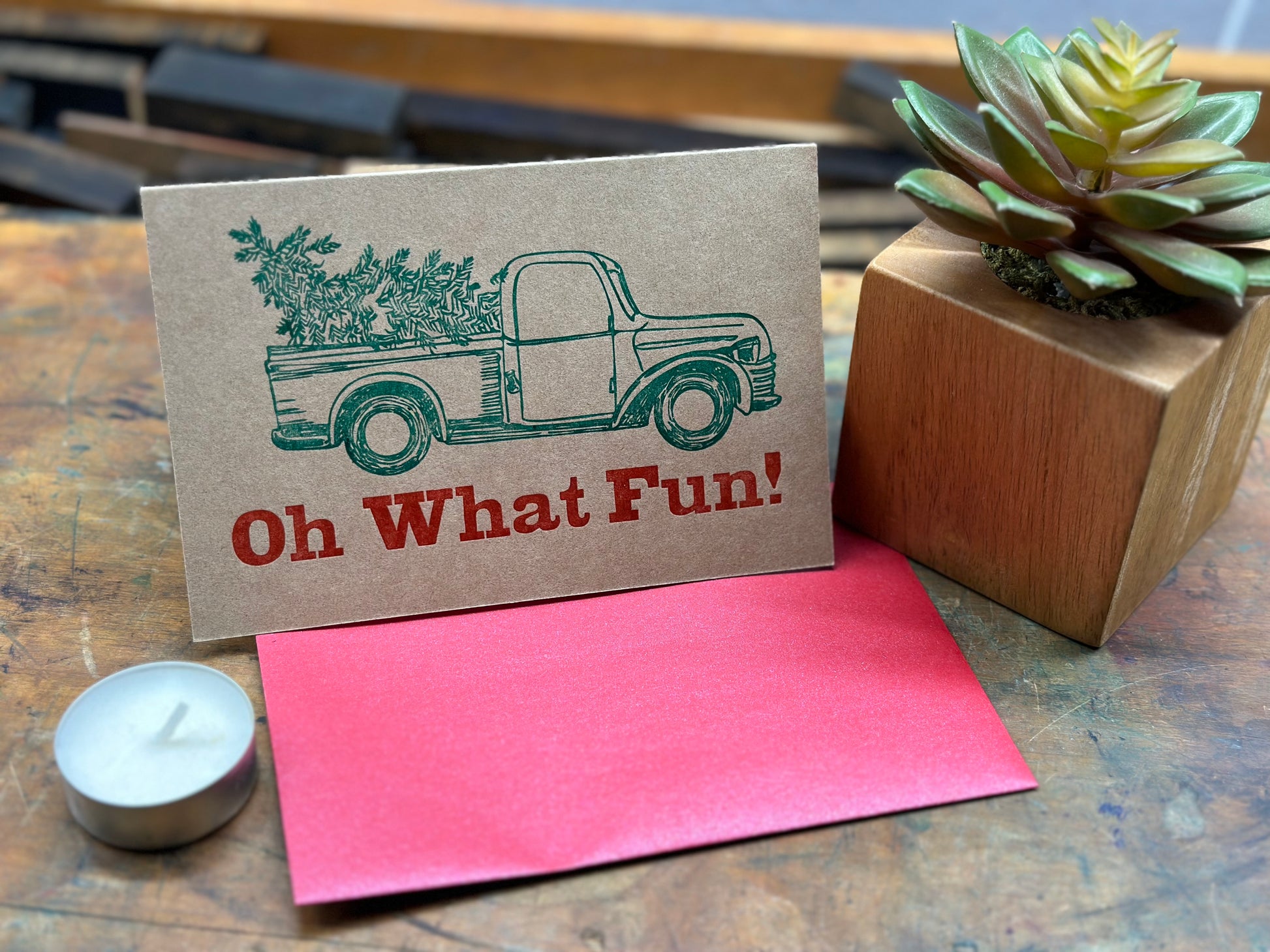 Oh What Fun! – 4x6 letterpress Christmas card on luxurious kraft paper, two-color, hand-printed on our restored 1909 Chandler & Price floor model printing press with a custom design using photopolymer plates and historic wood type. Blank inside