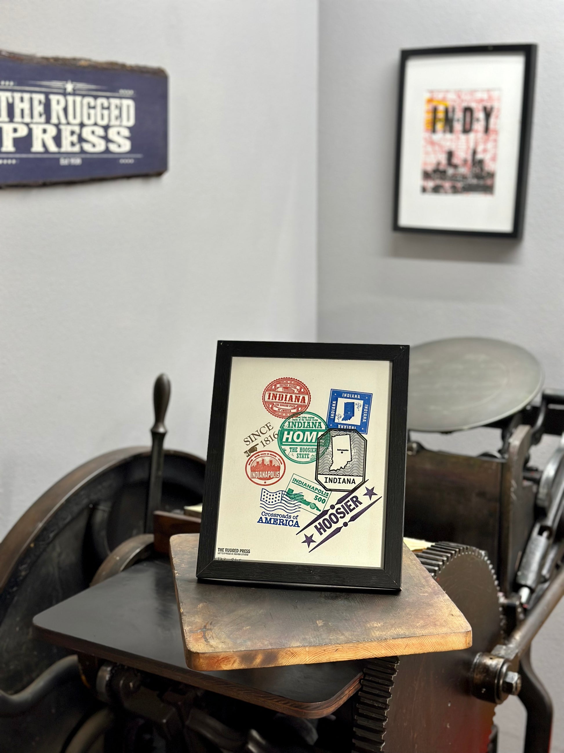 Passport to Indiana – 8x10 seven-color letterpress poster on Kraft, White, or Kiwi-colored paper, hand-printed on our restored 1909 Chandler & Price floor model printing press using historic metal and wood type and photopolymer plates.