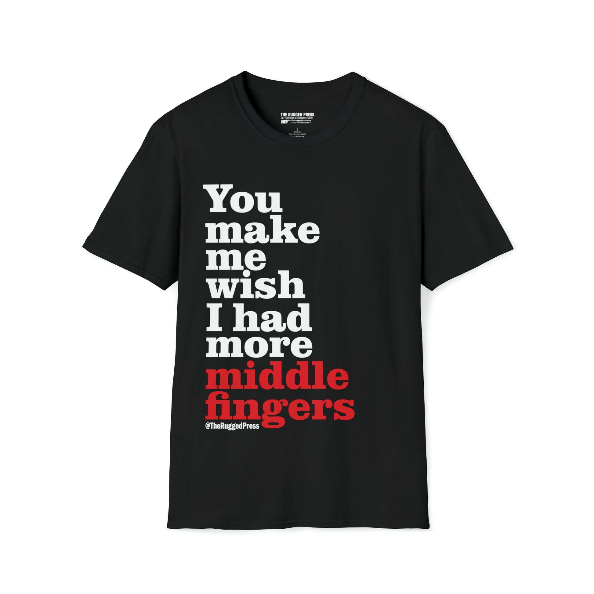 Tell them all how you really feel! Based on our best-selling design, our "You make me wish I had more middle fingers" shirt is just for you. Go out there and tell the world you are not afraid to use your God-given middle fingers.